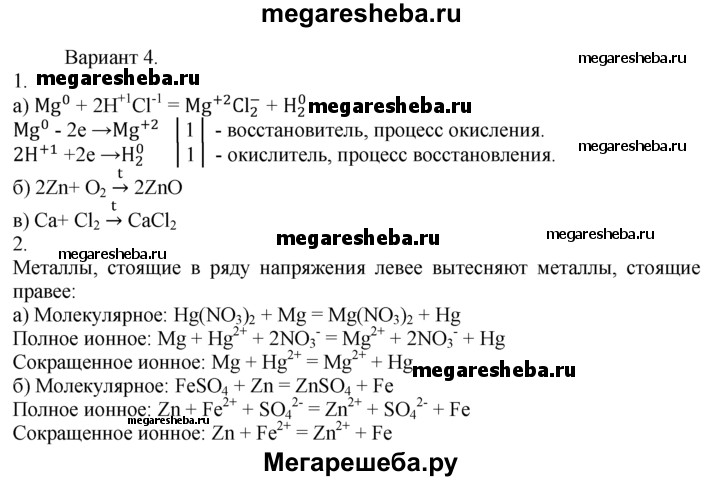 Вариант 4 1. Составьте уравнения реакций: а) магния с соляной кислотой; б) цинка с кислородом; в) кальция с хлором. В уравнении реакции а укажите степени окисления элементов и расставьте коэффициенты с помощью электронного баланса. 2. Укажите, между какими веществами произойдут химические реакции: а) магний и раствор нитрата ртути(ll); б) медь и раствор хлорида хрома(lll); в) цинк и раствор сульфата железа(ll). Напишите уравнения соответствующих реакций в молекулярной и сокращенной ионной формах.