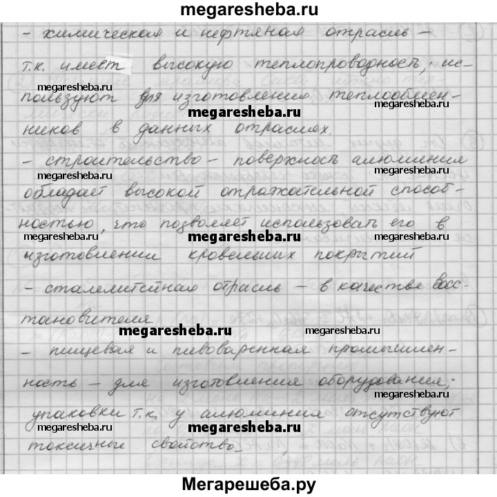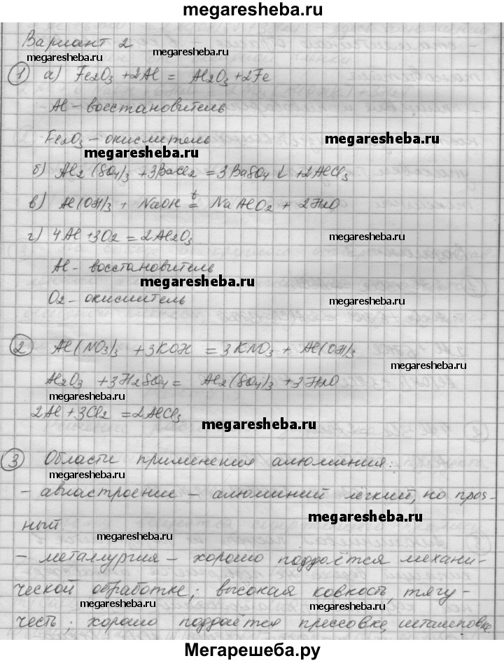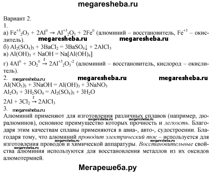 Вариант 2 1. Допишите уравнения химических реакций: а) Fe2O3 + Аl —> б) Al2(SO4)3 + ВаСl2 —> в) Аl(ОН)3 + NaOH —> г) Аl + O2 —> В окислительно-восстановительных реакциях укажите окислитель и восстановитель. 2. Напишите уравнения реакций, с помощью которых можно осуществить следующие превращения: Al(NO3)3 —> Аl(ОН)3; Аl2O3 —> Al2(SO4)3; Аl —> АlСl3 3. Опишите области применения алюминия и укажите свойства, на которых оно основано.