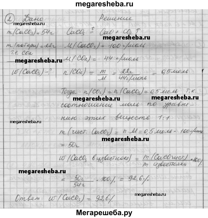 2. При прокаливании 54 г известняка потеря массы составила 22 г. Вычислите массовую долю карбоната кальция в этом образце известняка (известняк, кроме карбоната кальция, содержит неразлагающиеся вещества).