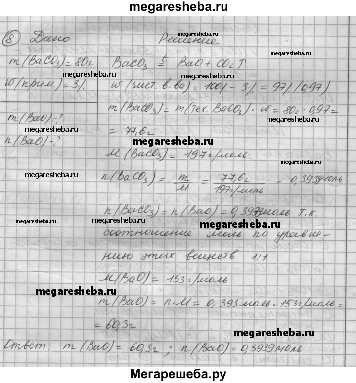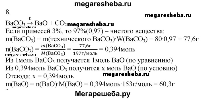 8. Рассчитайте массу и количество вещества оксида бария, образующегося при разложении 80 г карбоната бария, содержащего 3% примесей.