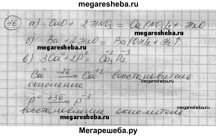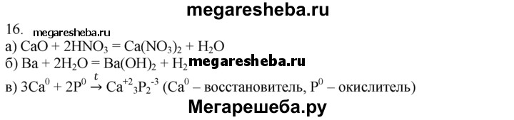 16. Напишите уравнения реакций: а) оксида кальция с азотной кислотой; б) бария с водой; в) кальция с фосфором. Реакцию в разберите как окислительно-восстановительную. Укажите степени окисления атомов, а также окислитель и восстановитель.