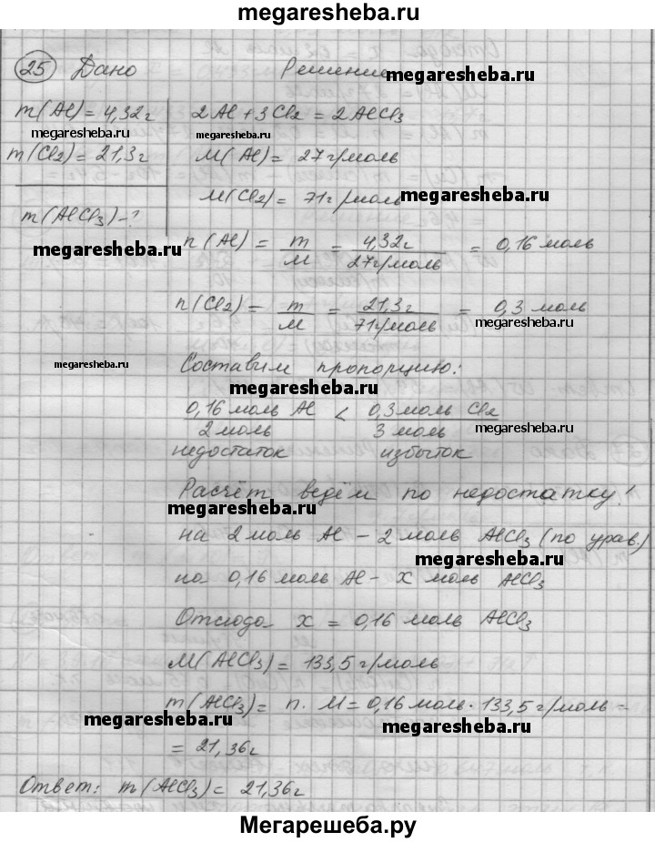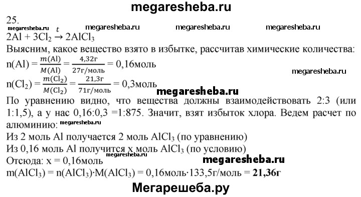 25. Рассчитайте массу соли, которую можно получить в результате взаимодействия 4,32 г алюминия с 21,3 г хлора.