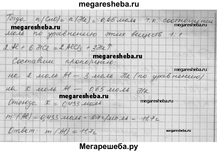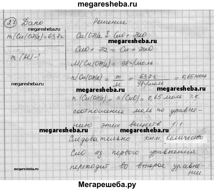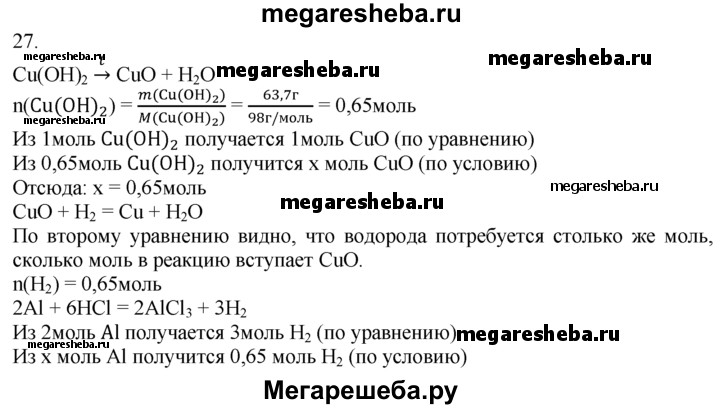27. Рассчитайте массу алюминия, который потребуется для получения водорода (при его взаимодействии с НСl), необходимого для восстановления оксида меди(ll), образовавшегося при разложении 63,7 г гидроксида меди(ll).