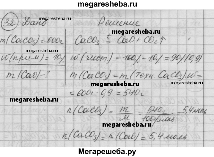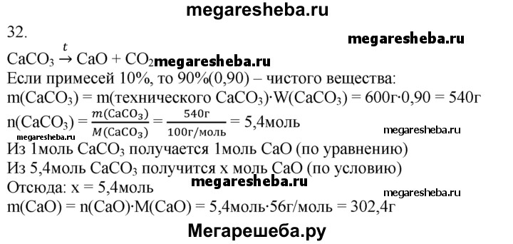 32. Рассчитайте массу оксида кальция, который можно получить при термическом разложении 600 г известняка, содержащего 10% примесей.