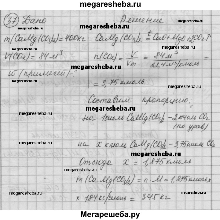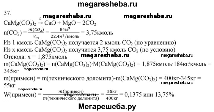 37. При прокаливании доломита массой 400 кг выделилось 84 м3 углекислого газа (н. у.). Вычислите массовую долю (%) некарбонатных примесей в доломите.