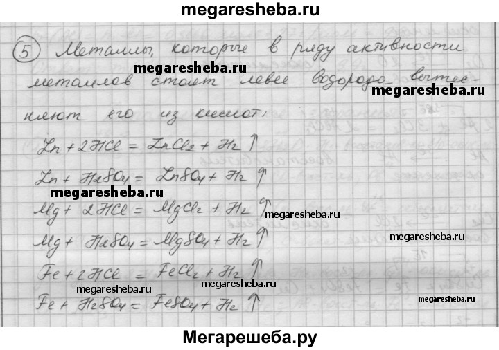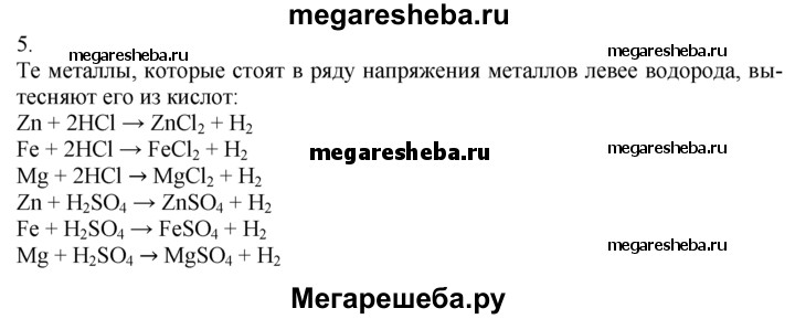 5. Назовите три металла, каждый из которых вытесняет водород из соляной и разбавленной серной кислот. Составьте уравнения протекающих реакций.