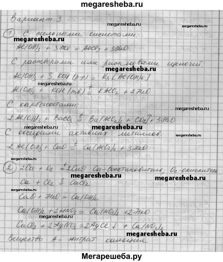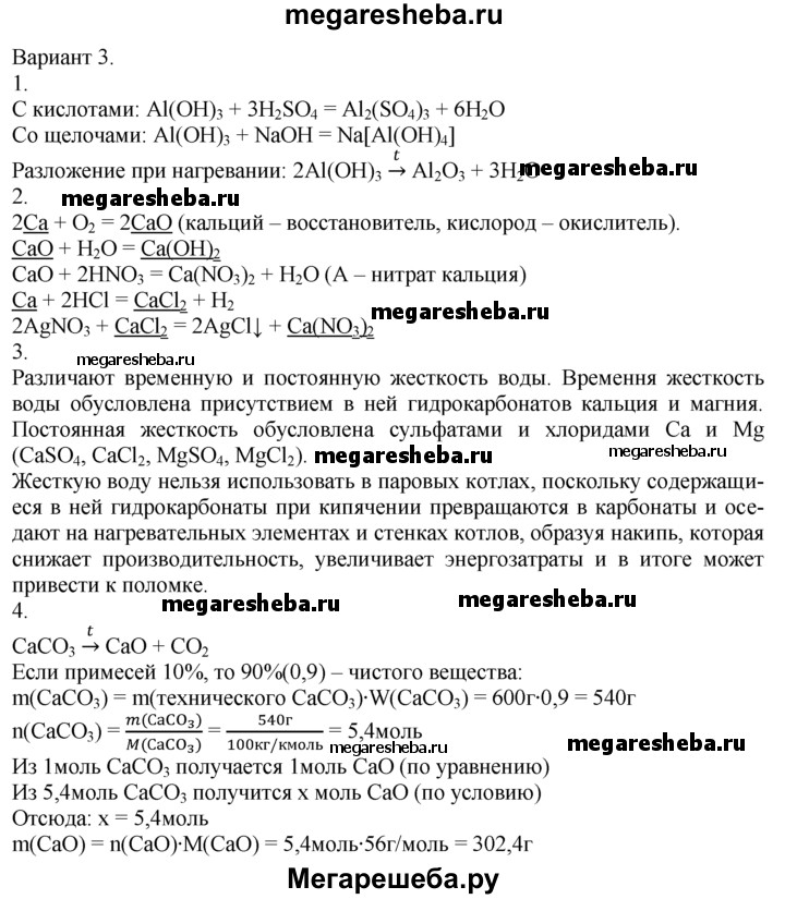 Вариант 3 1. Напишите уравнения реакций, характеризующих химические свойства гидроксида алюминия. 2. Напишите уравнения реакций, с помощью которых можно осуществить следующие превращения: В одном из окислительно-восстановительных процессов укажите окислитель и восстановитель. Назовите вещество А. 3. Чем обусловлена жесткость воды? Почему жесткую воду нельзя использовать в паровых котлах? 4. Рассчитайте массу оксида кальция, который можно получить при термическом разложении 600 г известняка, содержащего 10% примесей.