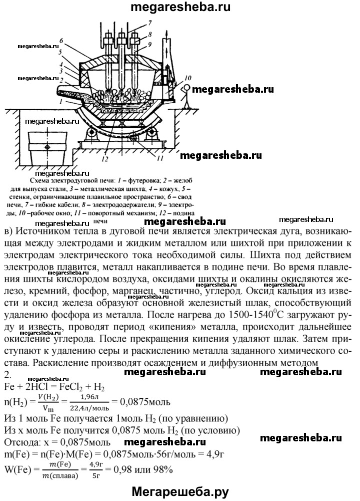 Вариант 3 1. Опишите технологию производства стали в электропечах по плану: а) сырье; б) аппарат для производства; в) основные химические реакции, протекающие при производстве. 2. Образец сплава железа с углеродом массой 5 г растворили в избытке соляной кислоты. По окончании реакции объем выделившегося водорода (н. у.) составил 1,96 л. Вычислите массовую долю железа в сплаве.
