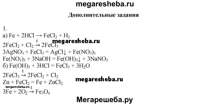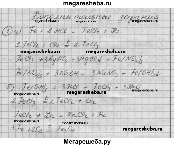 1. Напишите уравнения реакций, с помощью которых можно осуществить следующие превращения: а) Fe —> FeCl2 —> FeCl3 —> Fe(NO3)3 —> Fe(OH)3 б) Fe(OH)3 —> FeCl3 -> FeCl2 —> Fe —> Fe3O4