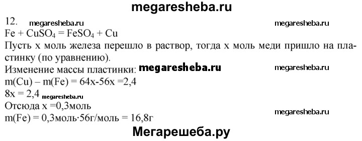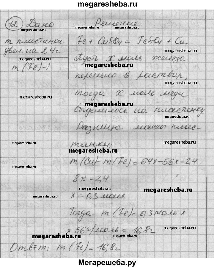 12. Железную пластинку погрузили в раствор сульфата меди. Через некоторое время ее высушили и взвесили. Масса пластинки увеличилась на 2,4 г. Рассчитайте массу железа, перешедшего в раствор.