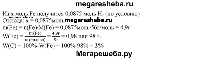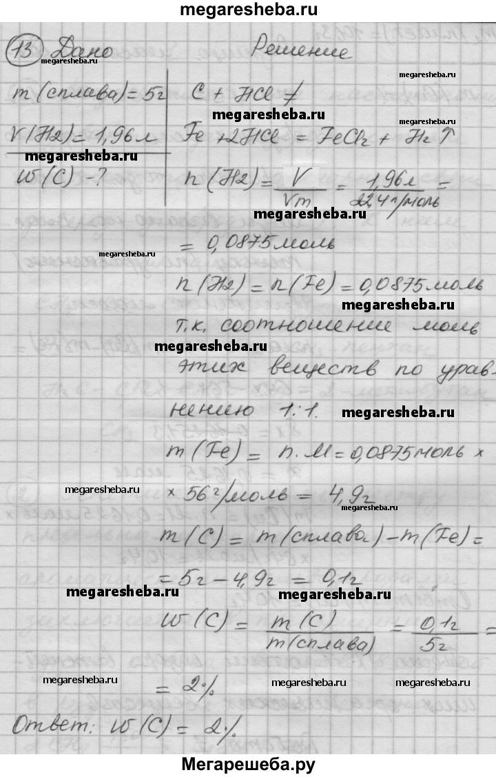 13. Сплав железа с углеродом массой 5 г обработали избытком соляной кислоты. По окончании реакции объем выделившегося газа составил 1,96 л (н. у.). Вычислите массовую долю (%) углерода в этом сплаве.