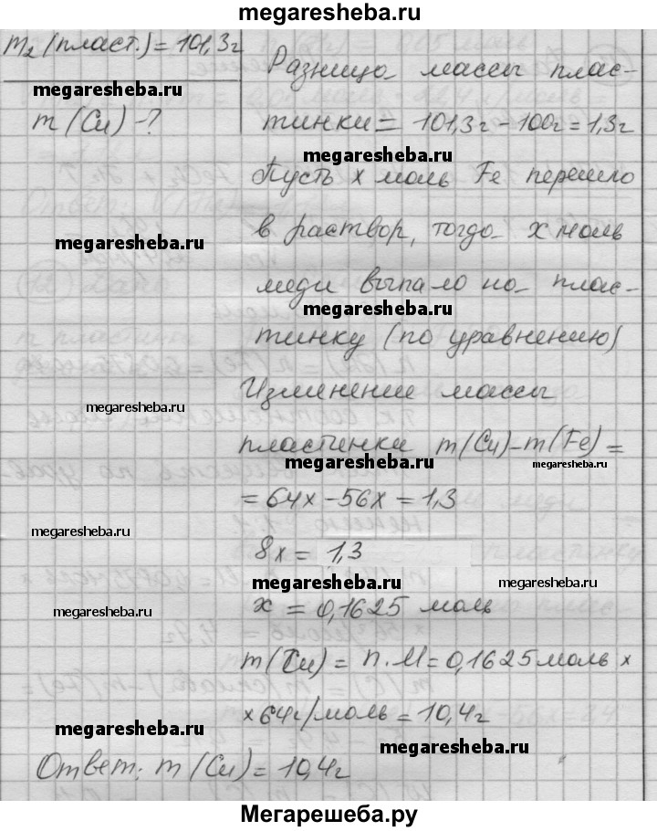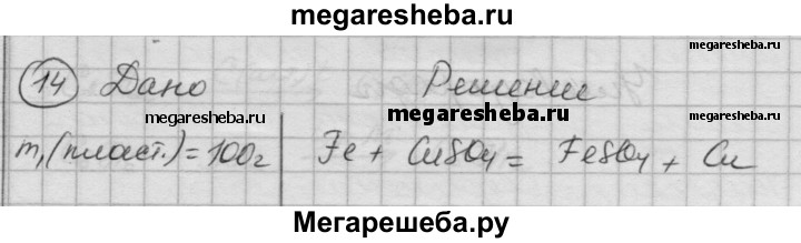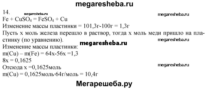 14. Железную пластинку массой 100 г погрузили в раствор сульфата меди(ll). Покрывшуюся медью пластинку высушили и снова взвесили. Ее масса оказалась теперь равной 101,3 г. Какая масса меди осадилась на пластинку?