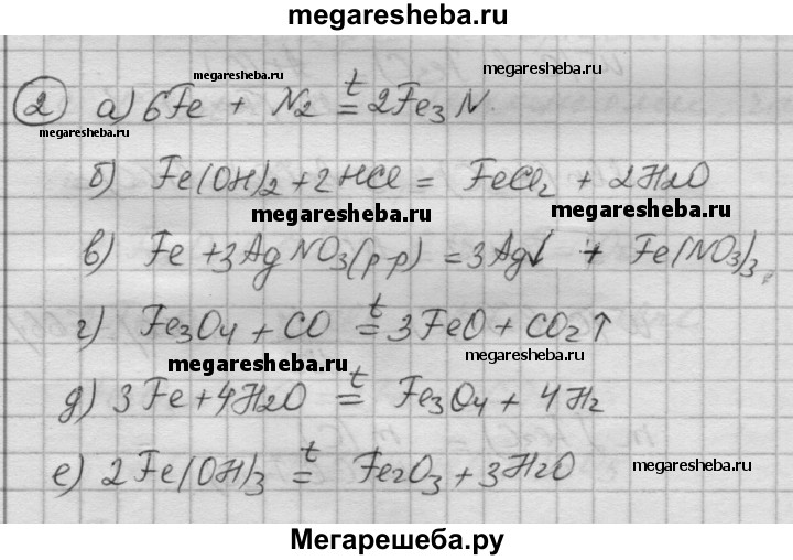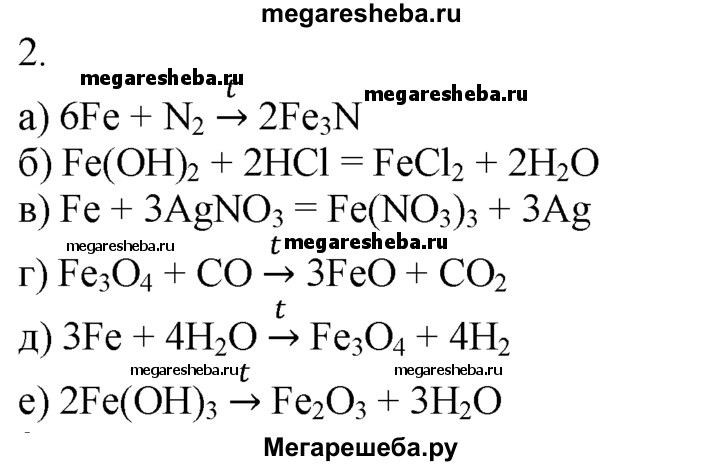 2. По приведенным схемам составьте уравнения химических реакций: a) Fe + N2 t-> б) Fe(OH)2 + НСl -> в) Fe + AgNO3(p-p) -> г) Fe3O4 + СО t-> д) Fe + Н2O t-> е) Fe(OH)3 t->