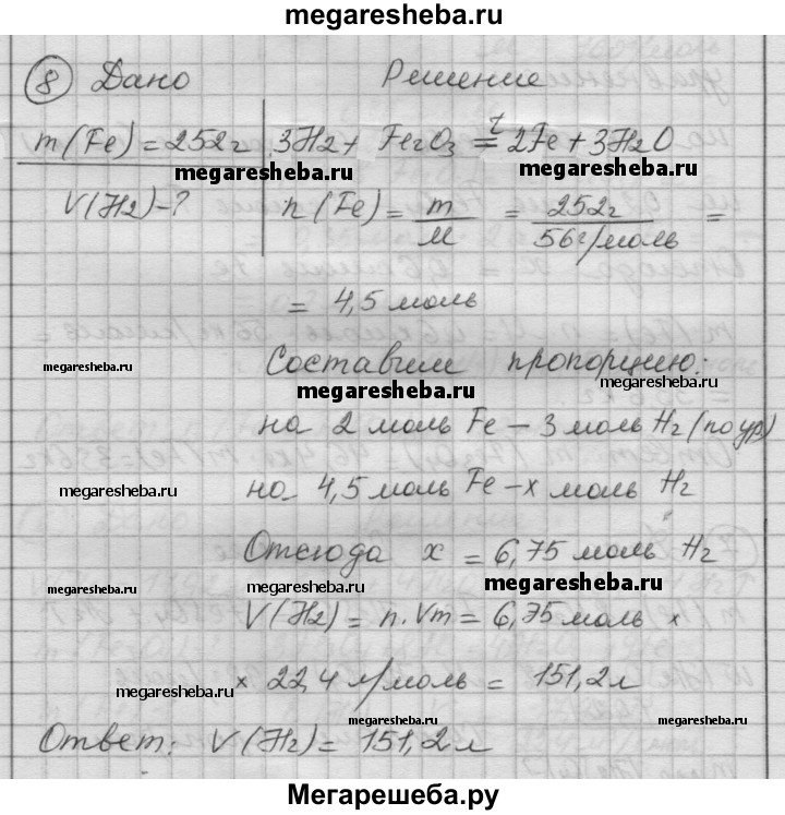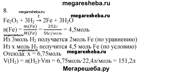 8. Рассчитайте объем водорода (н. у.), вступившего в реакцию с оксидом железа(lll), если при этом образовалось 252 г железа.