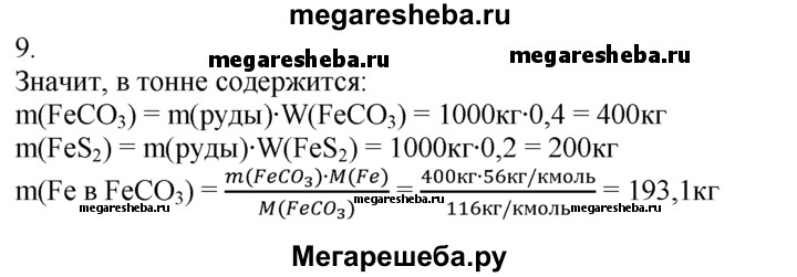 9. Железная руда содержит 40% сидерита FeCO3 и 20% пирита FeS2. Какая масса железа содержится в тонне этой руды?