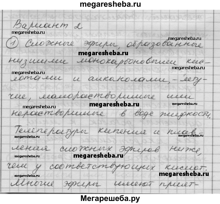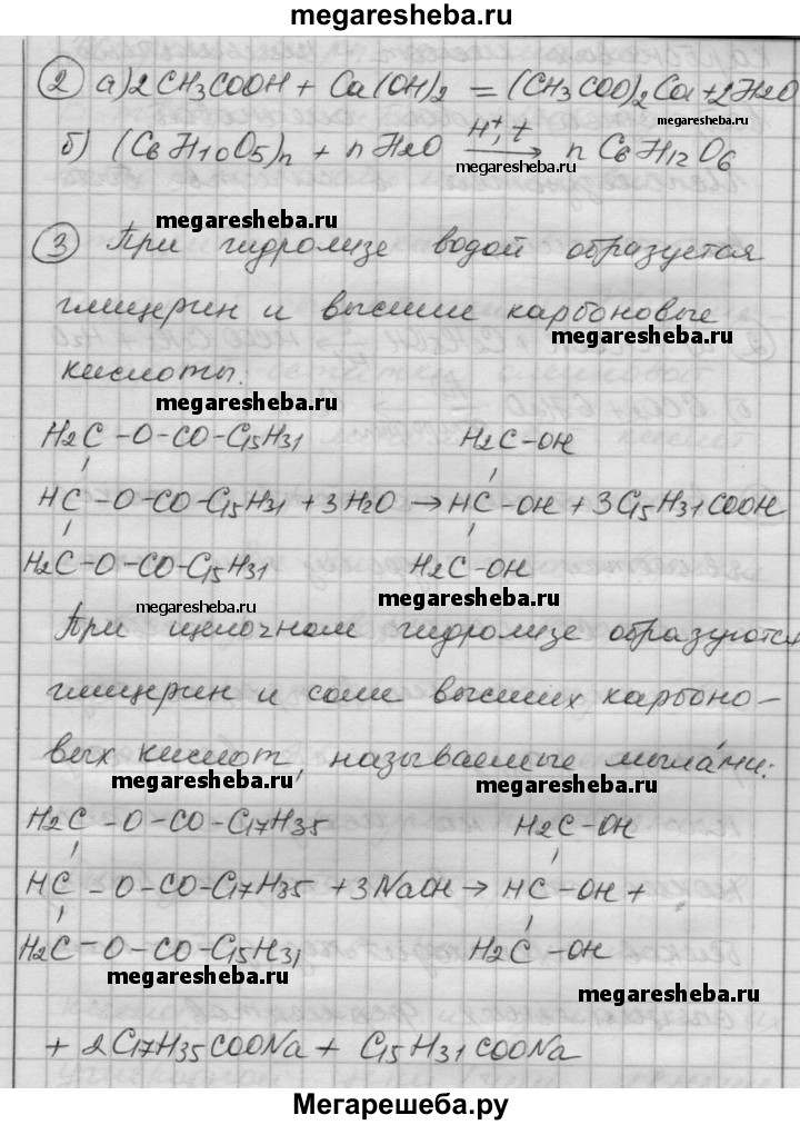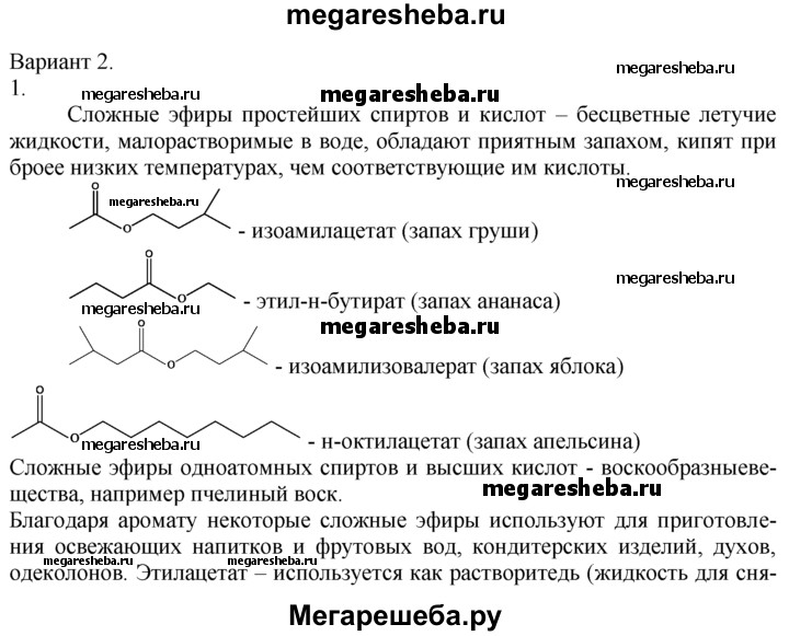Вариант 2 1. Перечислите физические свойства и области применения сложных эфиров. 2. По приведенным схемам составьте уравнения химических реакций: а) CH3 - COOH + Са(ОН)2 —> б) (С6Н10О5)n + nН2O t-> 3. Чем отличается по характеру образуемых продуктов способ гидролиза жиров водой от гидролиза жиров раствором щелочи?