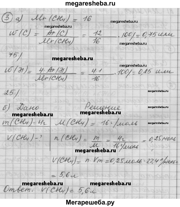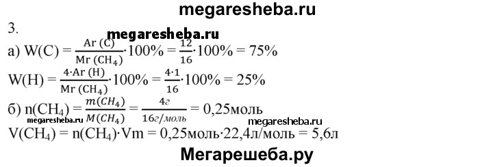 3. Рассчитайте: а) массовые доли элементов в молекуле метана; б) объем, который занимают 4 г метана (н. у.).