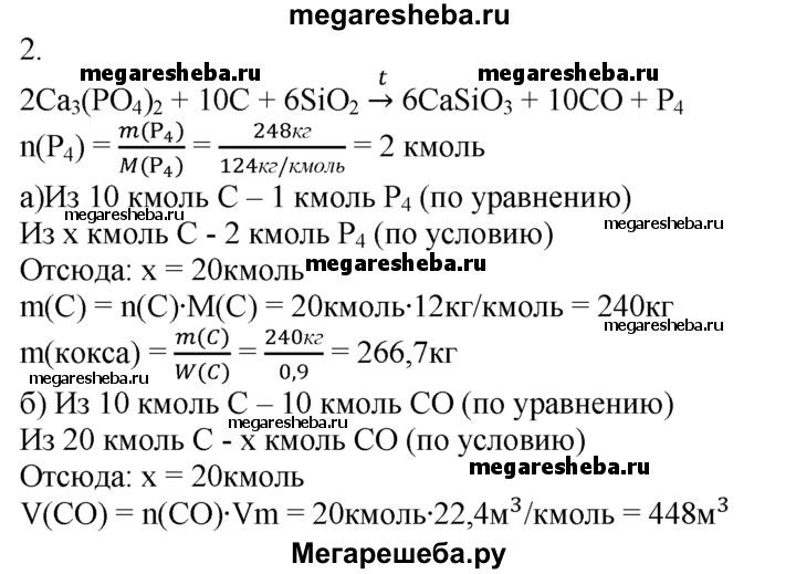 2. Белый фосфор получают восстановлением фосфата кальция, содержащегося в апатите и фосфорите, коксом и песком в электрических печах без доступа воздуха: 2Са3(РO4)2 + 10С + 6SiO2 t= 6CaSiO3 + 10COÎ + P4Î Пары фосфора конденсируются под водой. Рассчитайте массу кокса с массовой долей углерода 90%, необходимого для получения 248 кг фосфора. Какой объем оксида углерода(ll) (н. у.) выделится при этом?