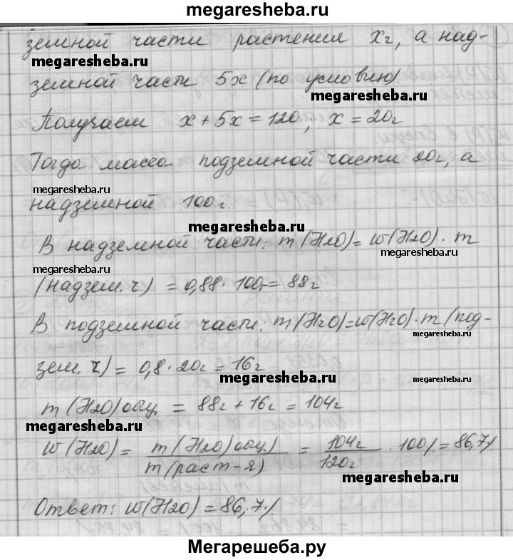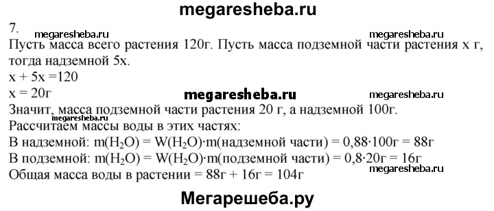 7. Массовая доля воды в надземной части растения составляет 88%, а в подземной — 80%. Какова массовая доля воды в растении, если надземная его часть в пять раз тяжелее подземной?