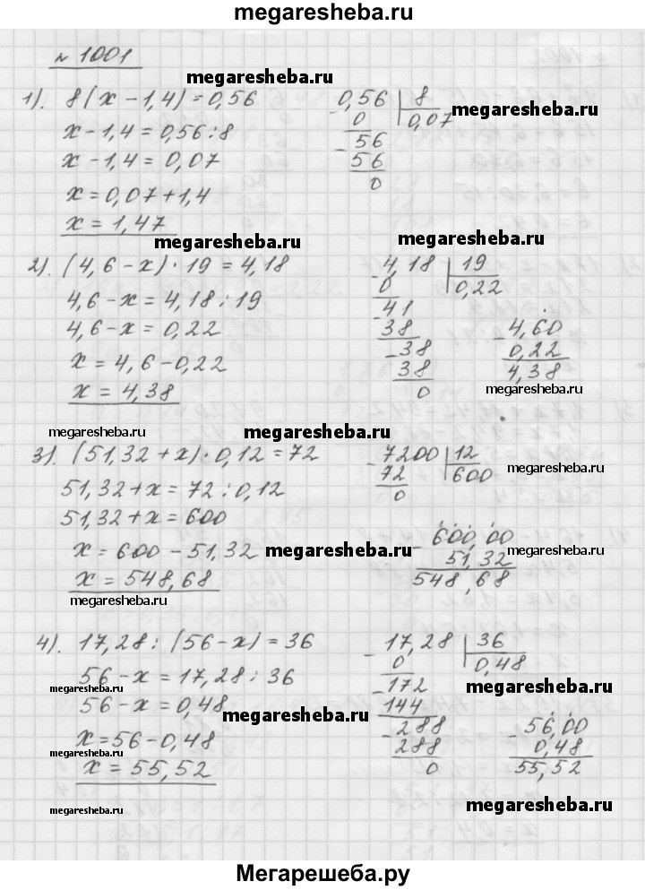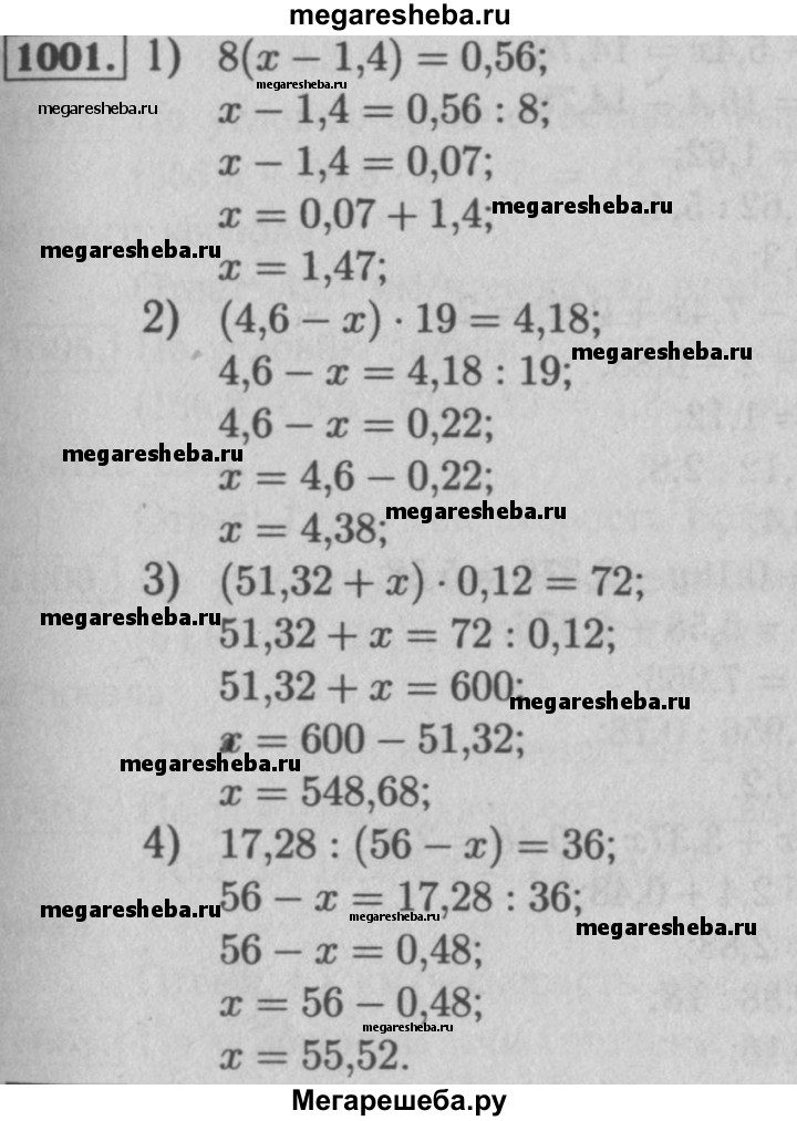 1001. Решите уравнение: 1) 8(x - 1,4) = 0,56; 2) (4,6-x) • 19 = 4,18; 3) (51,32 +x) • 0,12 = 72; 4) 17,28 :(56-x) = 36.