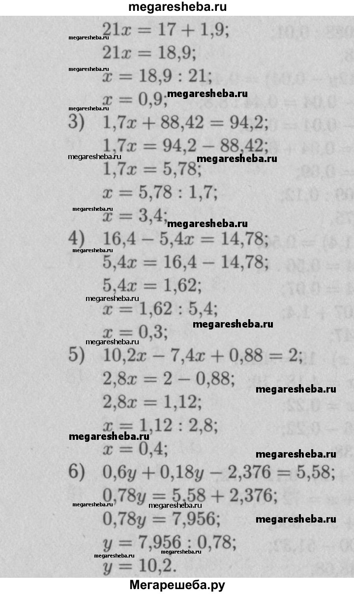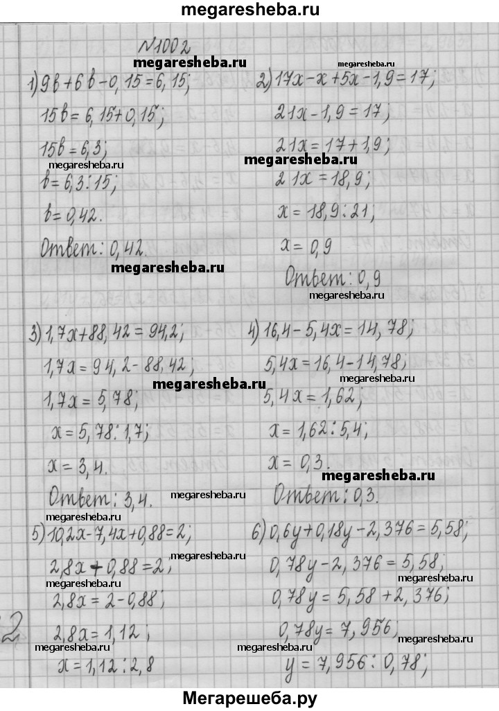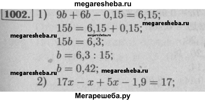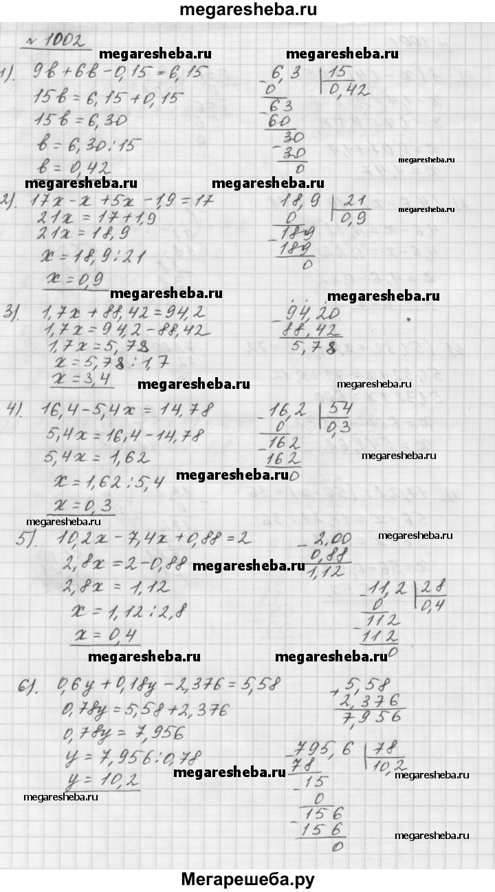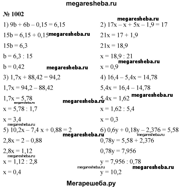1002. Найдите корень уравнения: 1) 9b + 6b - 0,15 = 6,15; 2) 17x- x + 5x - 1,9 = 17; 3) 1,7x + 88,42 = 94,2; 4) 16,4 - 5,4x = 14,78; 5) 10,2x - 7,4x + 0,88 = 2; 6) 0,6y + 0,18y - 2,376 = 5,58.