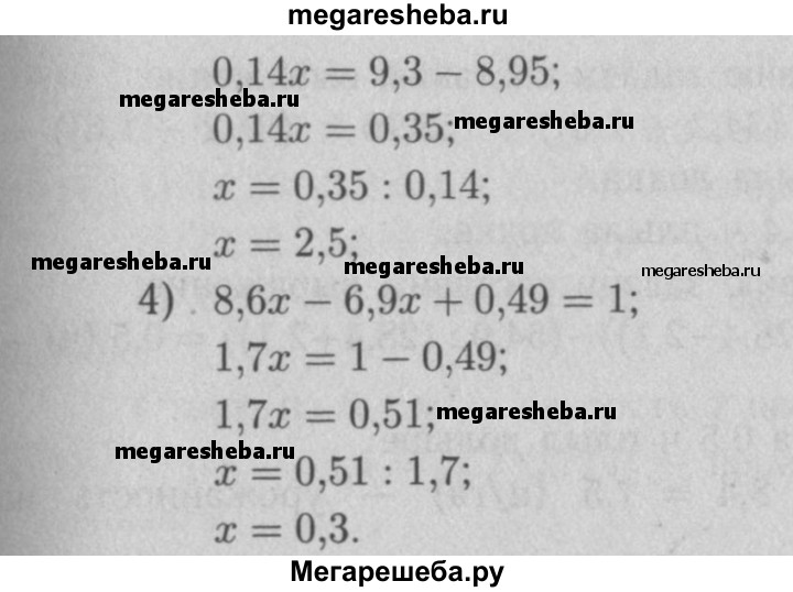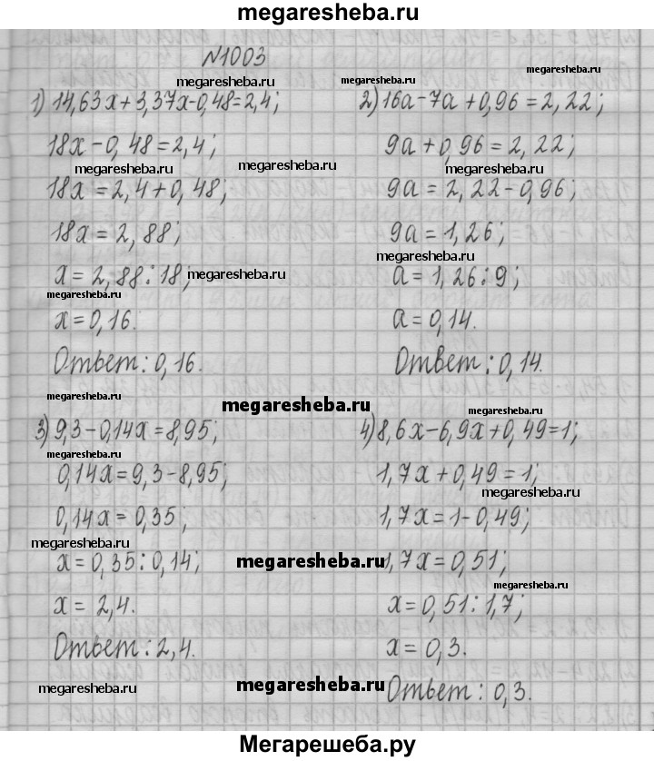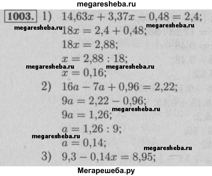 1003. Решите уравнение: 1) 14,бx + 3,37x - 0,48 = 2,4; 2) 16a - 7а + 0,96 = 2,22; 3) 9,3 - 0,14x = 8,95; 4) 8,6x - 6,9x + 0,49 = 1.