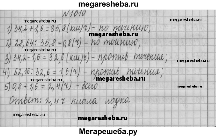 1010. Моторная лодка проплыла 28,64 км по течению реки и 52,16 км против течения. Сколько времени плыла лодка, если её собственная скорость равна 34,2 км/ч, а скорость течения — 1,6 км/ч?