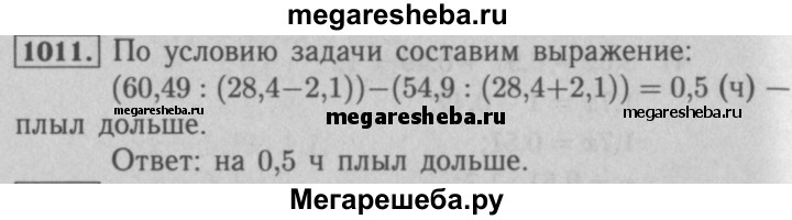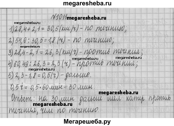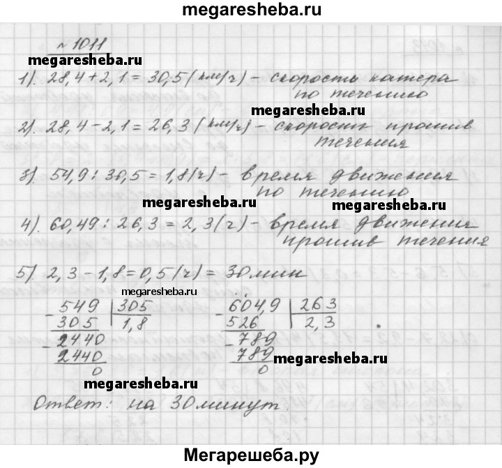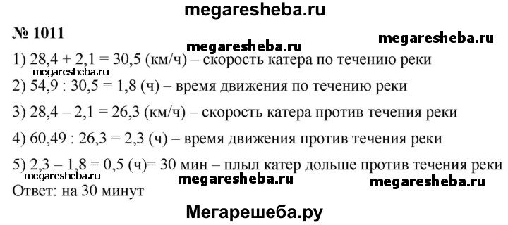 1011. Катер прошёл 54,9 км по течению реки и 60,49 км против течения. На сколько минут дольше шёл катер против течения, чем по течению, если скорость катера в стоячей воде равна 28,4 км/ч, а скорость течения — 2,1 км/ч?