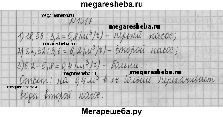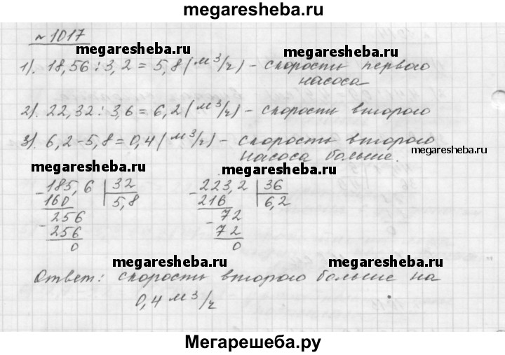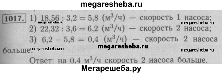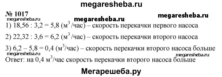 1017. Первый насос перекачивает 18,56 м^3 воды за 3,2 ч, а второй — 22,32 м^3 воды за 3,6 ч. У какого из насосов скорость перекачивания воды больше и на сколько кубических метров?