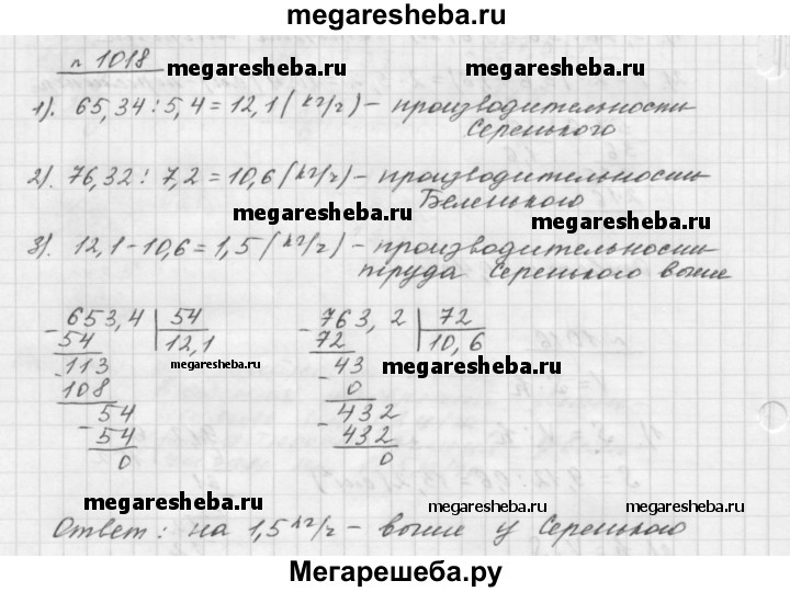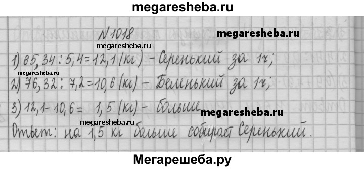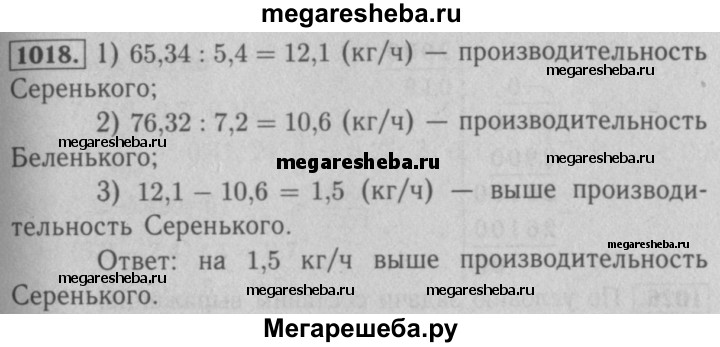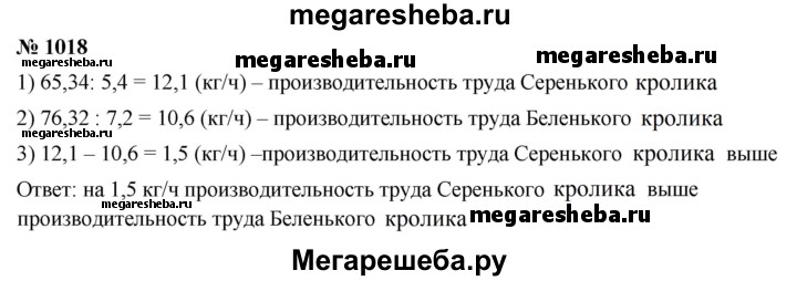 1018. Кролики Серенький и Беленький собирали капусту. Серенький собрал 65,34 кг за 5,4 ч, а Беленький — 76,32 кг за 7,2 ч. У кого из кроликов производительность труда (количество собранной капусты за 1 ч) выше и на сколько килограммов?
