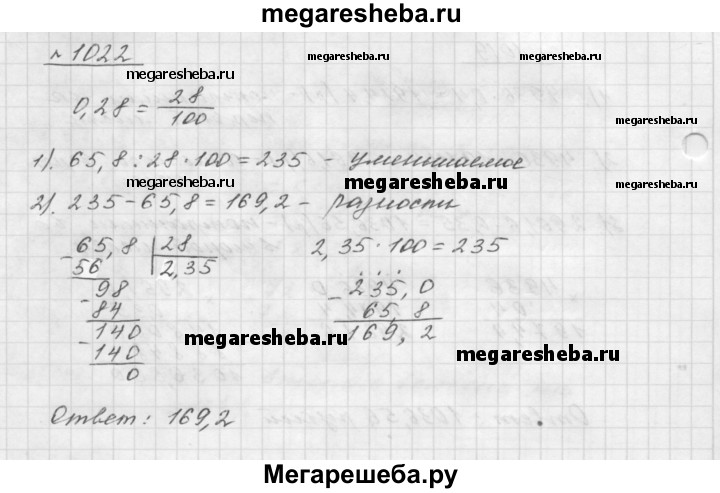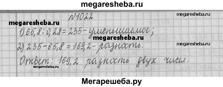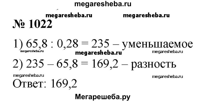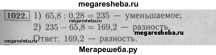 1022. Найдите разность двух чисел, если вычитаемое равно 65,8 и оно составляет 0,28 уменьшаемого.