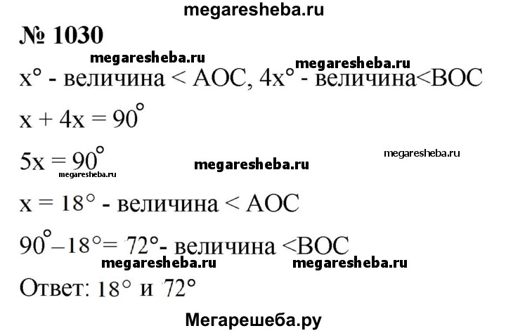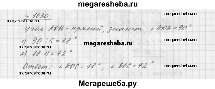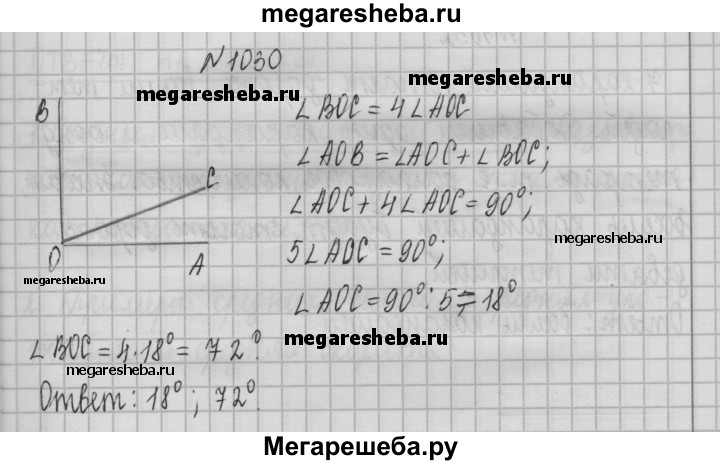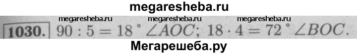 1030. Луч ОС делит прямой угол АОВ на два угла так, что угол АОС в 4 раза меньше угла ВОС. Найдите градусные меры углов АОС и ВОС.