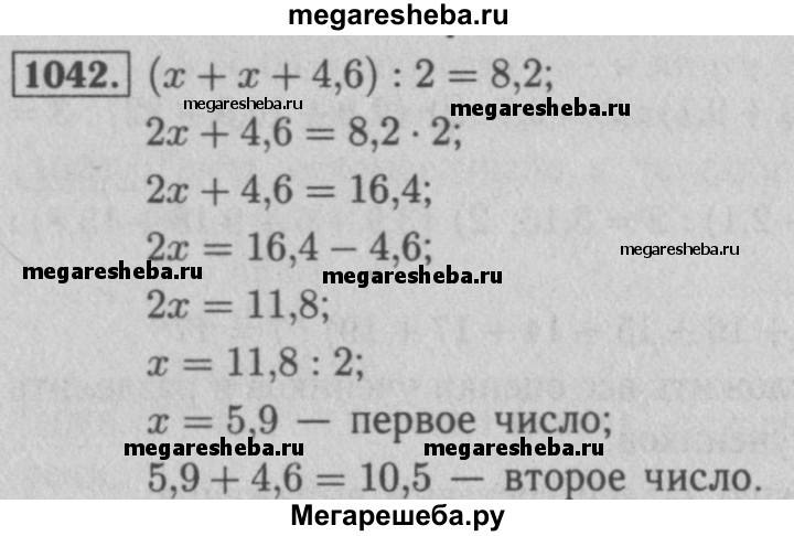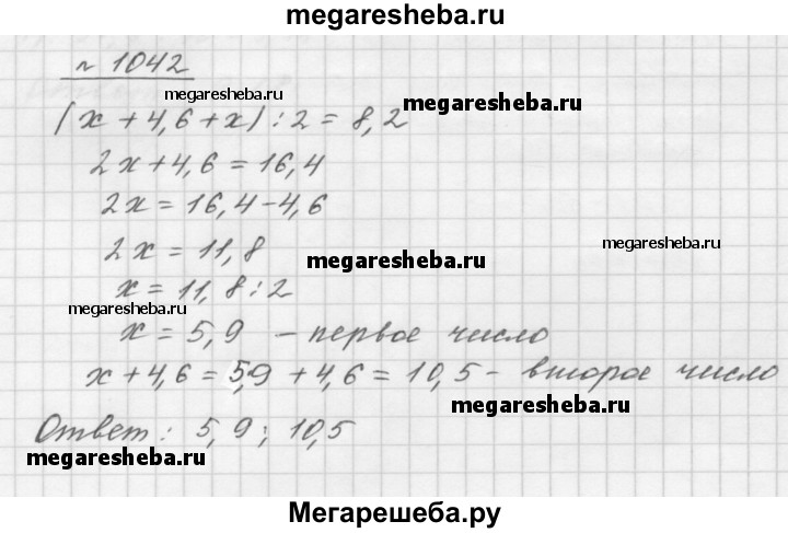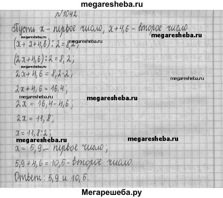 1042. Среднее арифметическое двух чисел, одно из которых на 4,6 больше второго, равно 8,2. Найдите эти числа.