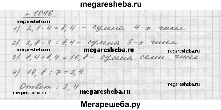 1046. Среднее арифметическое четырёх чисел равно 2,1, а среднее арифметическое трёх других чисел — 2,8. Найдите среднее арифметическое этих семи чисел.
