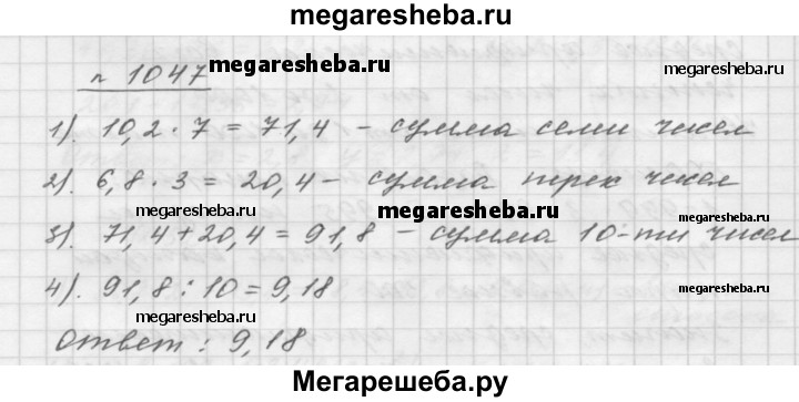 1047. Среднее арифметическое семи чисел равно 10,2, а среднее арифметическое трёх других чисел — 6,8. Найдите среднее арифметическое этих десяти чисел.
