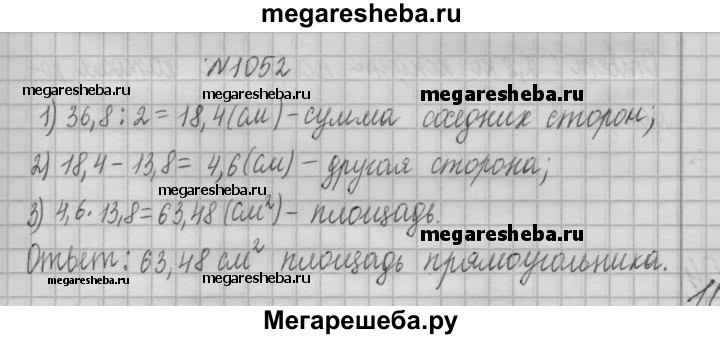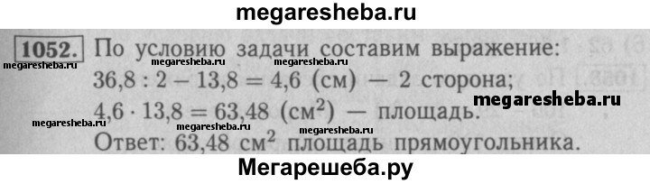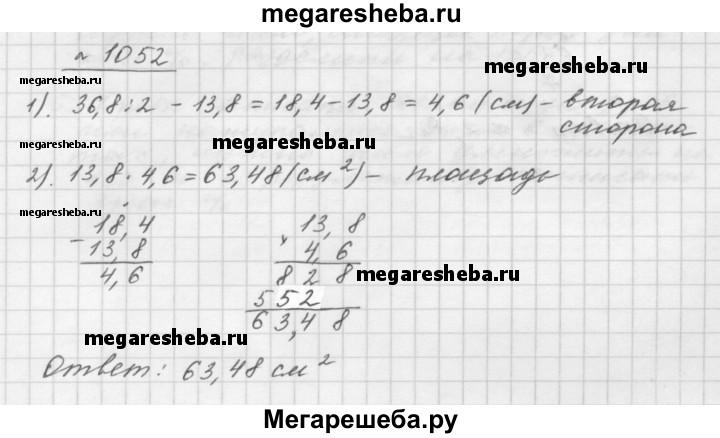 1052. Периметр прямоугольника равен 36,8 см, а одна из его сторон — 13,8 см. Вычислите площадь прямоугольника.