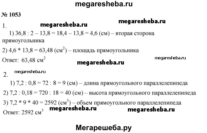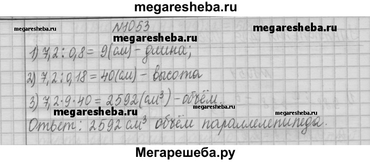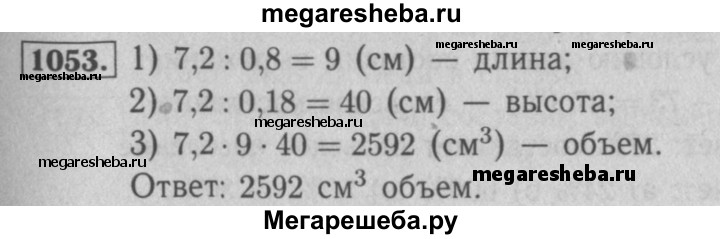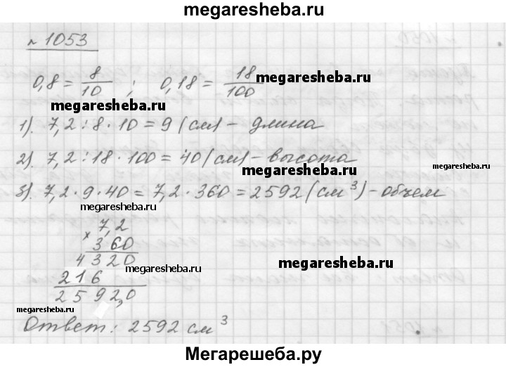 1053. Ширина прямоугольного параллелепипеда равна 7,2 см, что составляет 0,8 его длины и 0,18 его высоты. Вычислите объём параллелепипеда.