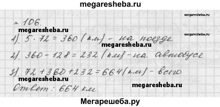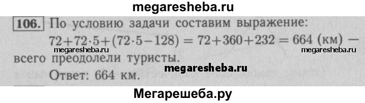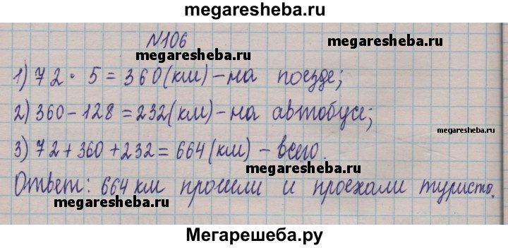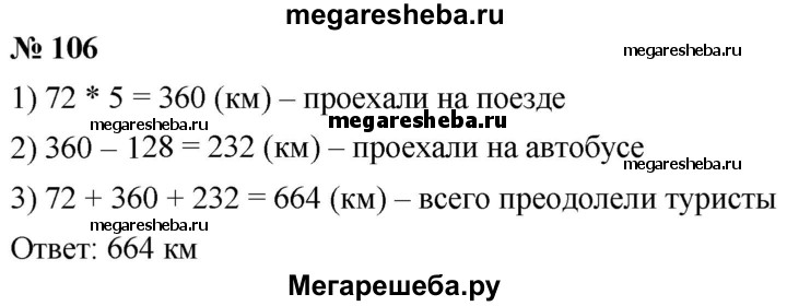 106. Группа туристов прошла пешком 72 км, проехала на поезде расстояние в 5 раз большее, чем прошла пешком, а на автобусе проехала на 128 км меньше, чем на поезде. Сколько всего километров прошли и проехали туристы?