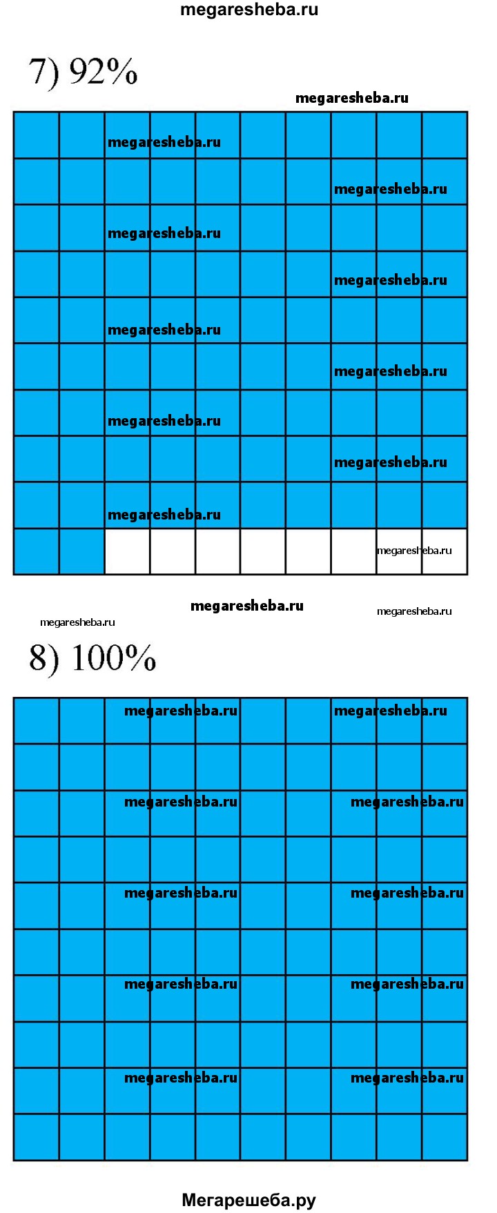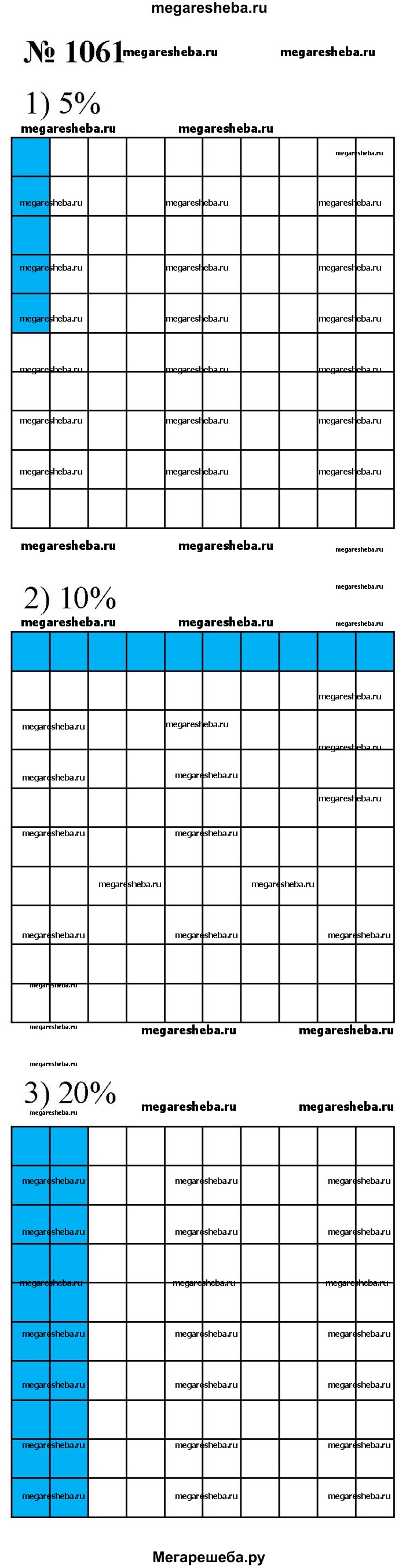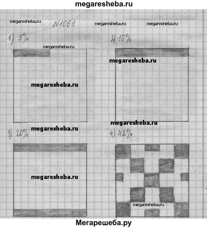 1061. Начертите квадрат, сторона которого в 10 раз больше стороны тетрадной клетки. Закрасьте часть квадрата, площадь которой от площади квадрата составляет: 1) 5 %; 2) 10 %; 3) 20 %; 4) 42 %; 5) 50 %; 6) 67 %; 7) 92%; 8) 100%.