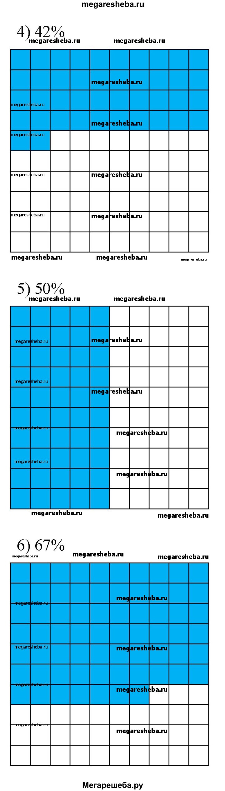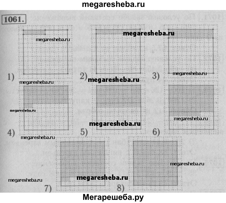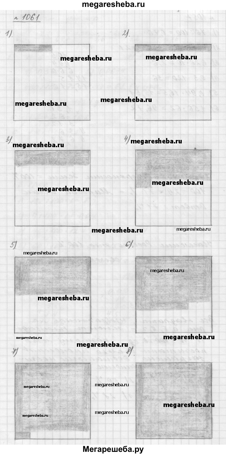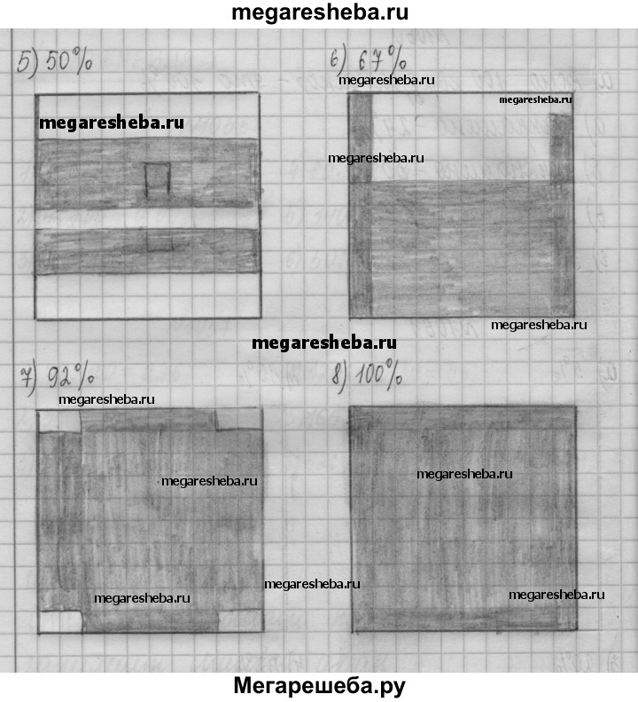 1061. Начертите квадрат, сторона которого в 10 раз больше стороны тетрадной клетки. Закрасьте часть квадрата, площадь которой от площади квадрата составляет: 1) 5 %; 2) 10 %; 3) 20 %; 4) 42 %; 5) 50 %; 6) 67 %; 7) 92%; 8) 100%.
