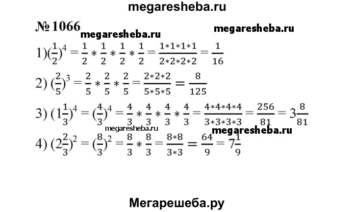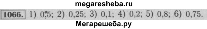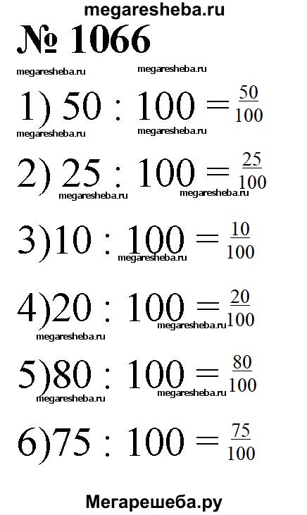 1066. Запишите в виде обыкновенной дроби: 1) 50 %; 2) 25 %; 3) 10 %; 4) 20 %; 5) 80 %; 6) 75 %.