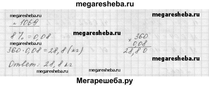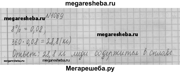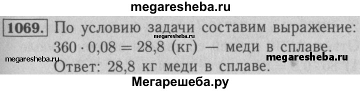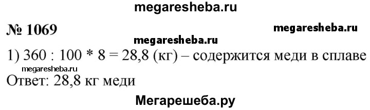 1069. Сплав содержит 8 % меди. Сколько килограммов меди содержится в 360 кг сплава?