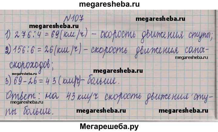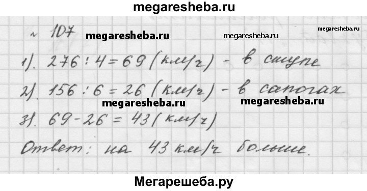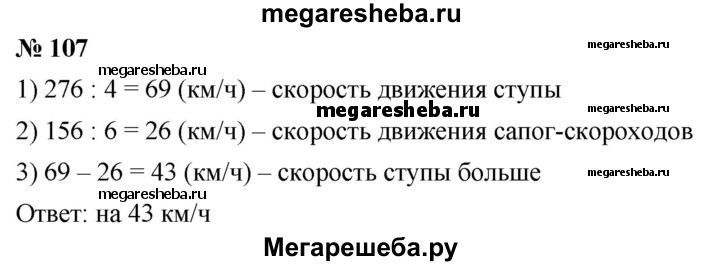 107. Отправившись в гости к Змею Горынычу, Баба-яга пролетела в своей ступе 276 км за 4 ч, а остальные 156 км прошла за 6 ч в сапогах-скороходах. На сколько скорость движения ступы больше, чем скорость движения сапог-скороходов?