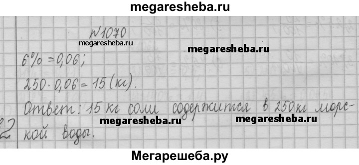 1070. В морской воде содержится 6 % соли. Сколько соли содержится в 250 кг морской воды?