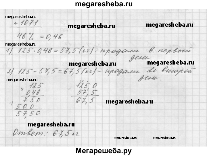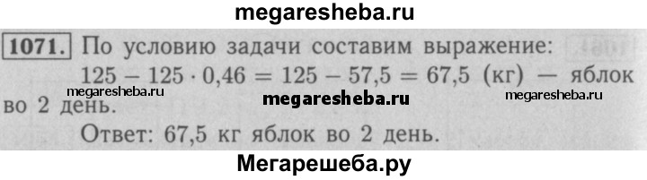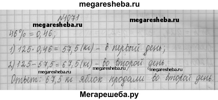1071. 3а два дня продали 125 кг яблок, причём в первый день продали 46 % яблок. Сколько килограммов яблок продали во второй день?