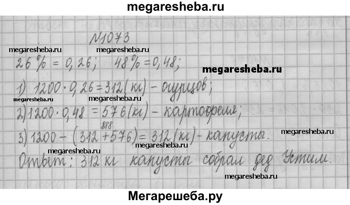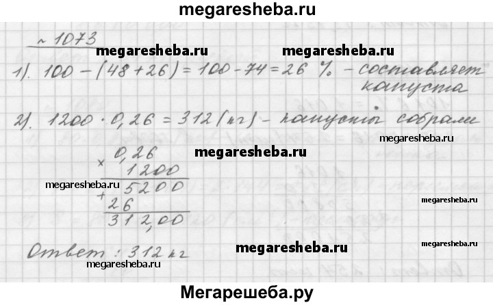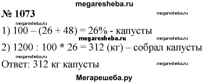 1073. Дед Устим собрал со своего огорода 1 200 кг овощей. Из них 26 % составляли огурцы, 48 % — картофель, а остальное — капуста. Сколько килограммов капусты собрал дед Устим?