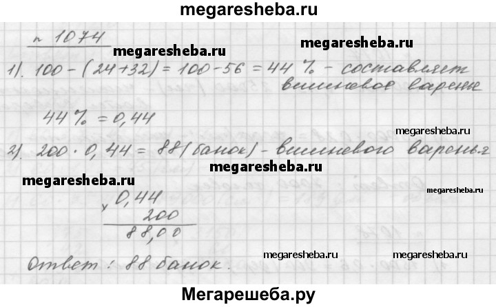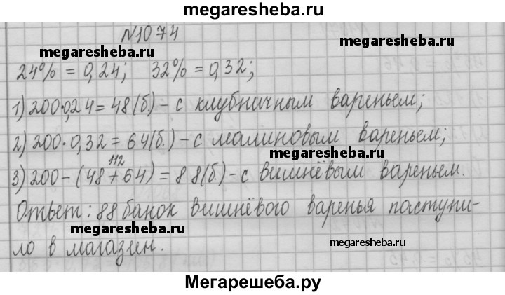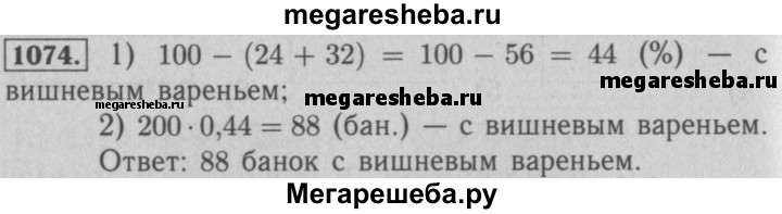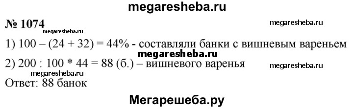 1074. В магазин поступило 200 банок варенья. 24 % этого количества составляли банки с клубничным вареньем, 32 % — с малиновым, а остальное — с вишнёвым. Сколько банок вишнёвого варенья поступило в магазин?