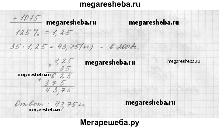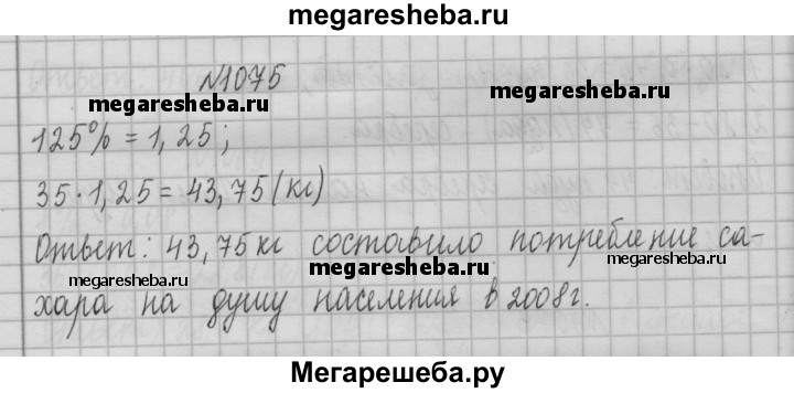 1075. В 1995 г. потребление сахара в Российской Федерации составляло 35 кг на душу населения. В 2008 г. потребление сахара на душу населения составило 125 % по отношению к 1995 г. Сколько килограммов составило потребление сахара на душу населения в 2008 г.?