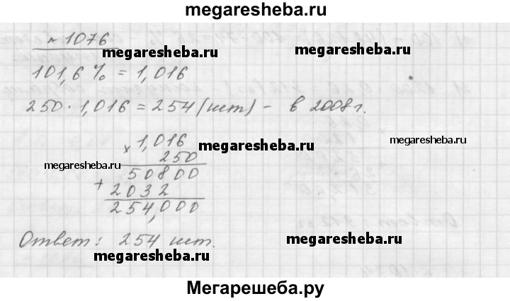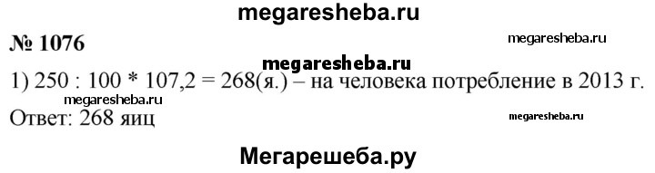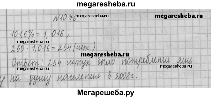 1076. В 2005 г. потребление яиц в Российской Федерации составляло 250 штук на душу населения. В 2008 г. потребление яиц на душу населения составило 101,6 % по отношению к 2005 г. Каким было потребление яиц на душу населения в 2008 г.?