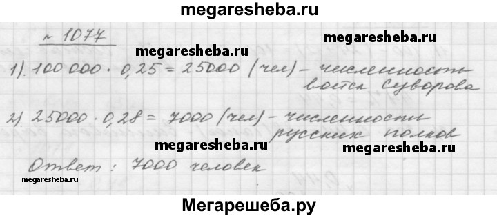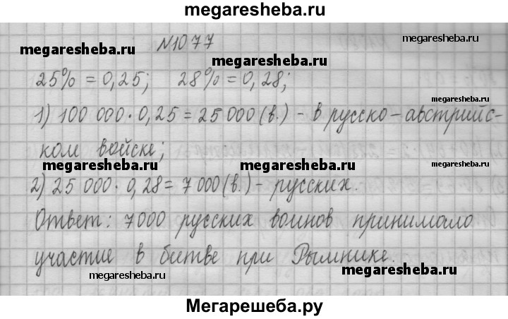1077. Во время Русско-турецкой войны 1787-1791 гг. состоялось сражение при реке Рымник. 11 сентября 1789 г. объединённое русско-австрийское войско под командованием великого русского полководца А.В. Суворова разбило стотысячную турецкую армию. Численность войск под руководством Суворова составляла 25 % численности турецкой армии, а численность русских полков составляла 28 % численности русско-австрийского войска. Сколько русских воинов принимало участие в битве при Рымнике?